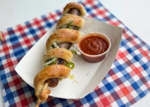 Italian sausage wrapped in homemade dough with marinated peppers and onions, baked golden, brushed with garlic butter, and dusted with Parmesan. Served on a stick with dunk‑ready, family‑recipe marinara.